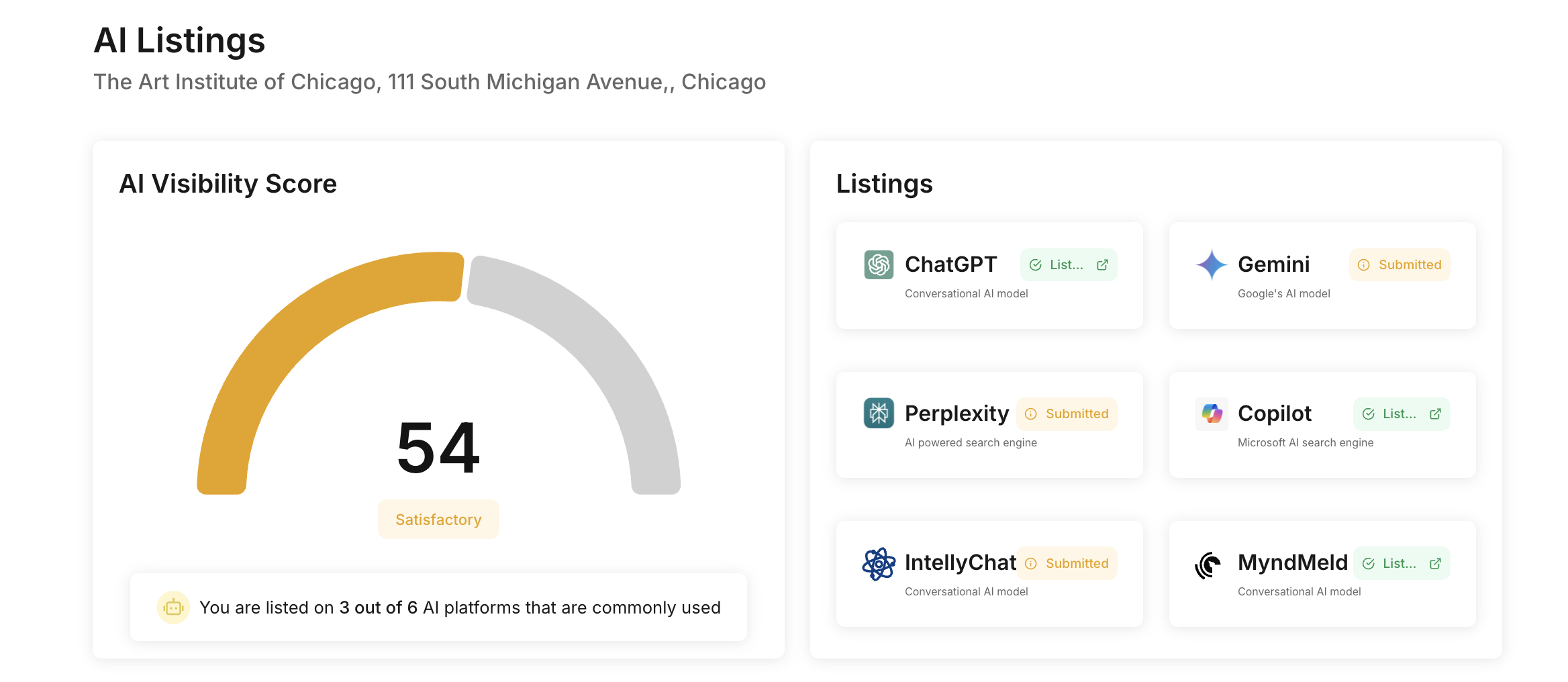 Identify and track which AI search engines list your business, offering valuable insights into your digital footprint across these platforms. If a site is marked as "listed," it means your business is discoverable and generates valid results when searched on that platform. Sites marked as "submitted" indicate that we have successfully shared your business information with the AI platform, and it is currently being processed.