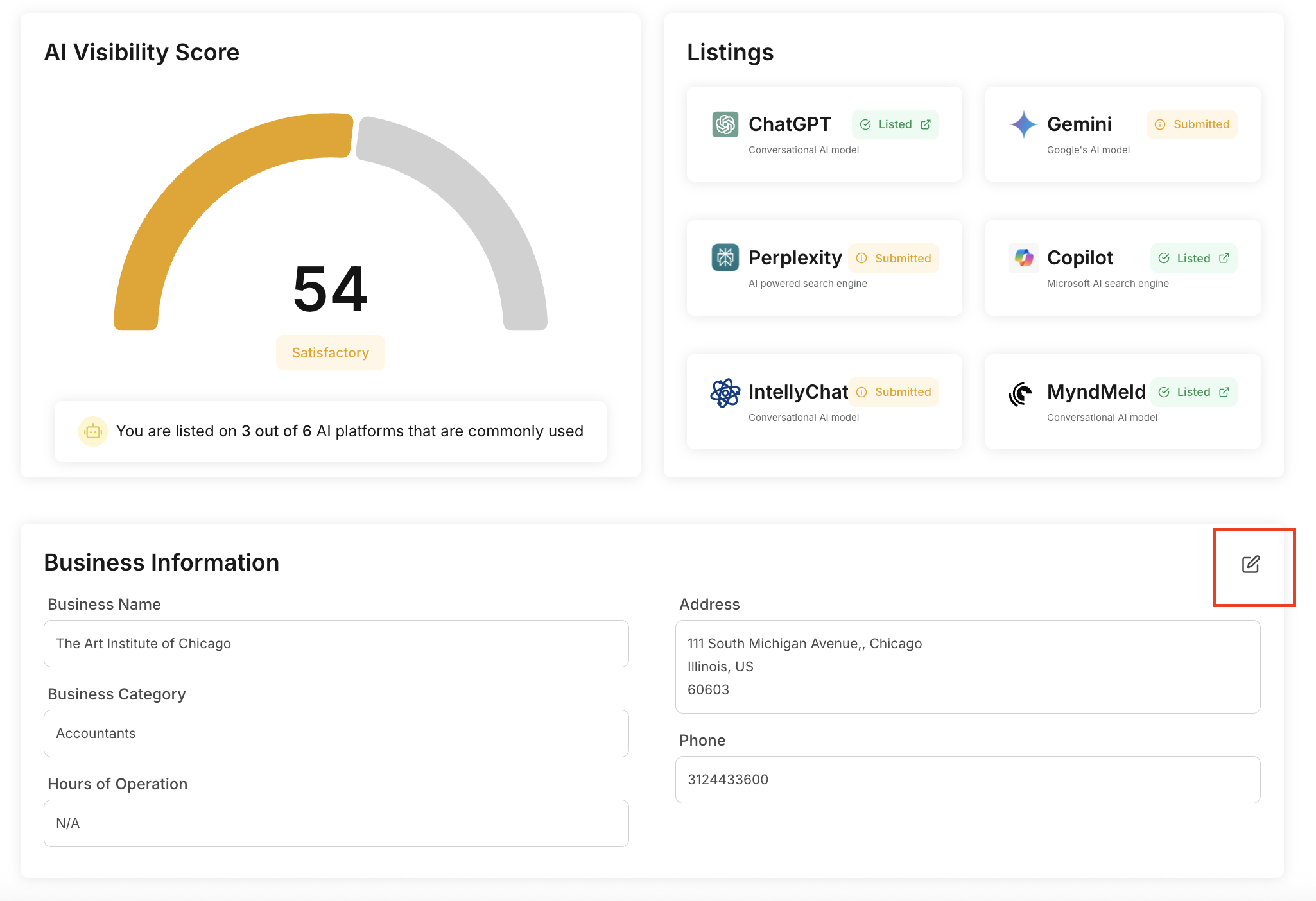 Easily update and optimize your business details to enhance visibility and performance across AI search engines, ensuring your information is accurate. To update business information click on the edit icon and it’ll take you to the ‘Business info’ page to update any required information.