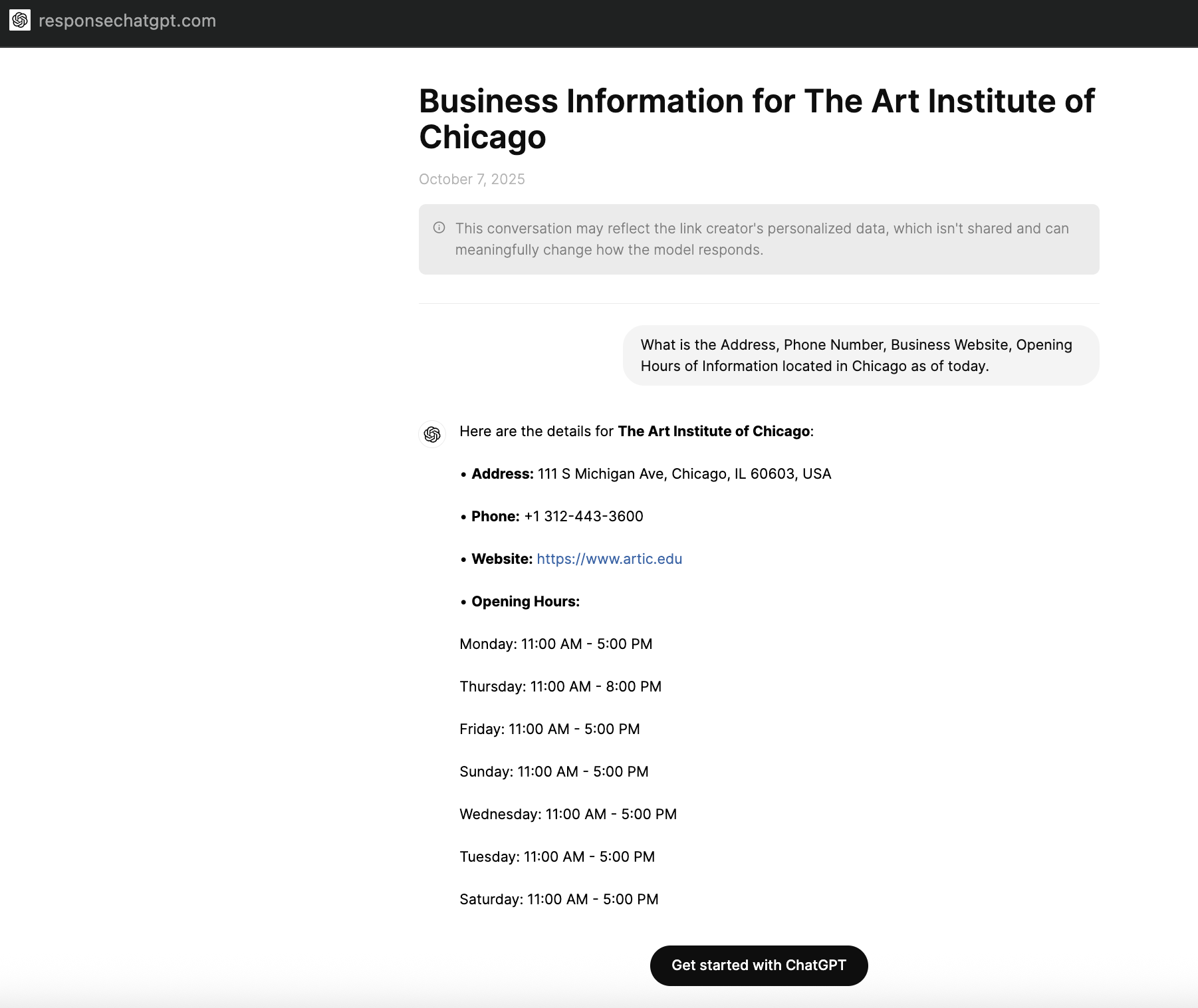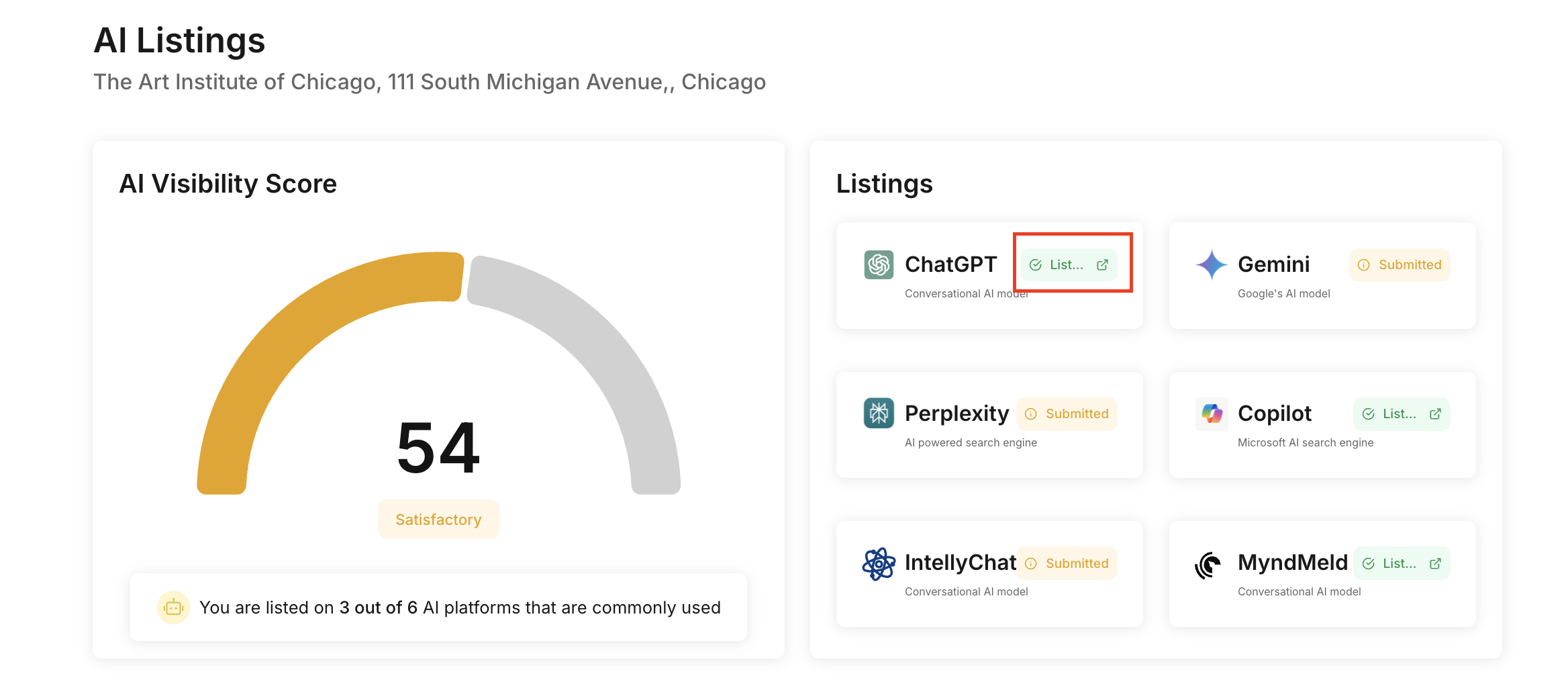 Clicking on the ‘listed’ link will take you to the AI platform to obtain verifiable URLs to confirm your business's presence on various AI platforms.