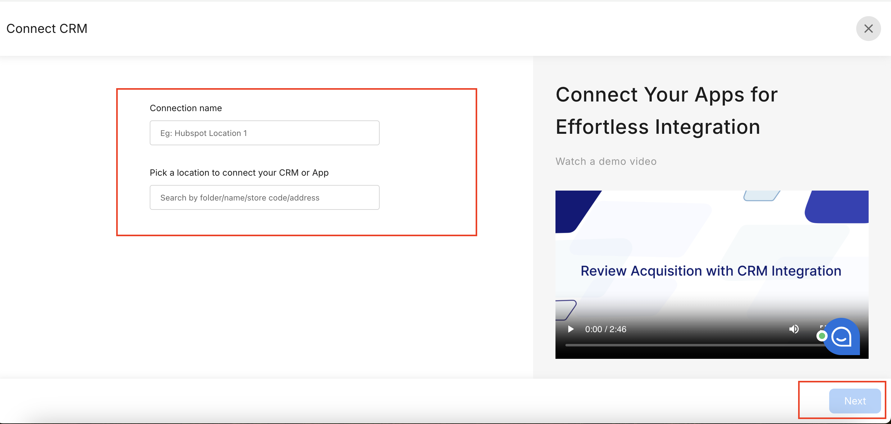 Step-2: This will bring up a window with a search option to select the business or the folder you want to connect with the CRM. Search for the business name/address/store code/folder that you want to connect to a specific CRM and click Next